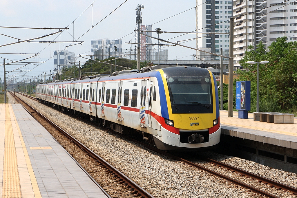 KTM Class 92, Garnitur SCS 27 (Bo′Bo′+2′2′+Bo′Bo′+Bo′Bo′+2′2′+Bo′Bo′, Hersteller: CSR Zhuzhou Electric Locomotive Co.Ltd., Baujahr: 2011) mit den Fahrzeugnummern C9253-T9253-M9253-M9254-T9254-C9254 fährt am 18.Februar 2025 in die Stesen Bukit Tengah ein.