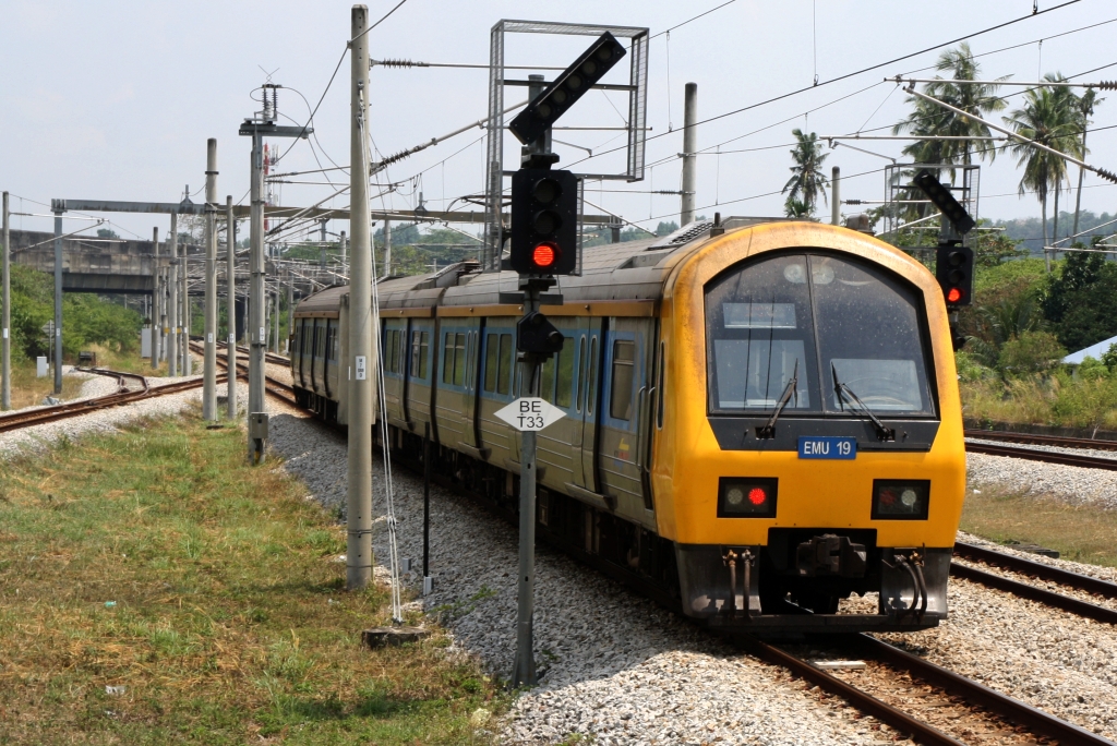 KTM Triebwagen Class 83 EMU 19 (Fzg.Nr. C8301 + T8301 + C8302) verlässt am 18.Februar 2025 die Stesen Bukit Tengah.