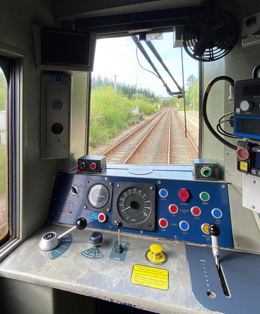 Blick in den hinteren Führerstand von Dieseltriebzug 158712 während des Abwartens des Gegenzuges. Lairg, 7.5.2025