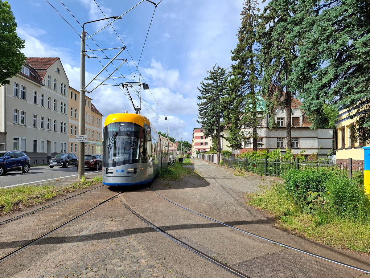 LVB Leipzig__Der Betrieb im Leipziger Straßenbahnnetz funktioniert auch auf den eingleisigen Abschnitten einwandfrei, wie hier mit NGT10 Nr.1035 auf Linie 3 bei der Einfahrt in die Endschleife Taucha.__05-2025