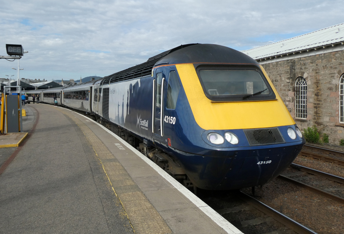Scotrail 43150 wartet auf die Abfahrt. Inverness, 8.5.2025