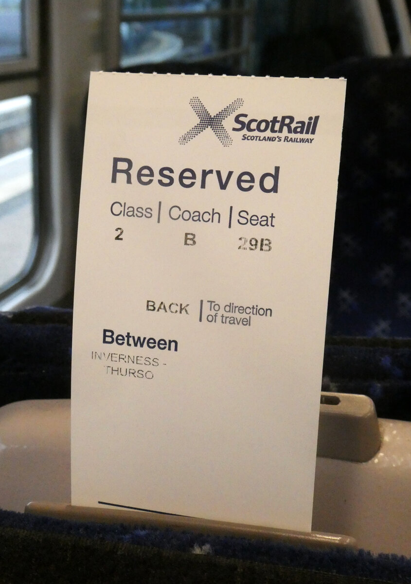 Sogar im 'Regionalzug' von Inverness nach Thurso kann der Sitzplatz reserviert werden, und erst noch umsonst. Inverness, 7.5.2025
