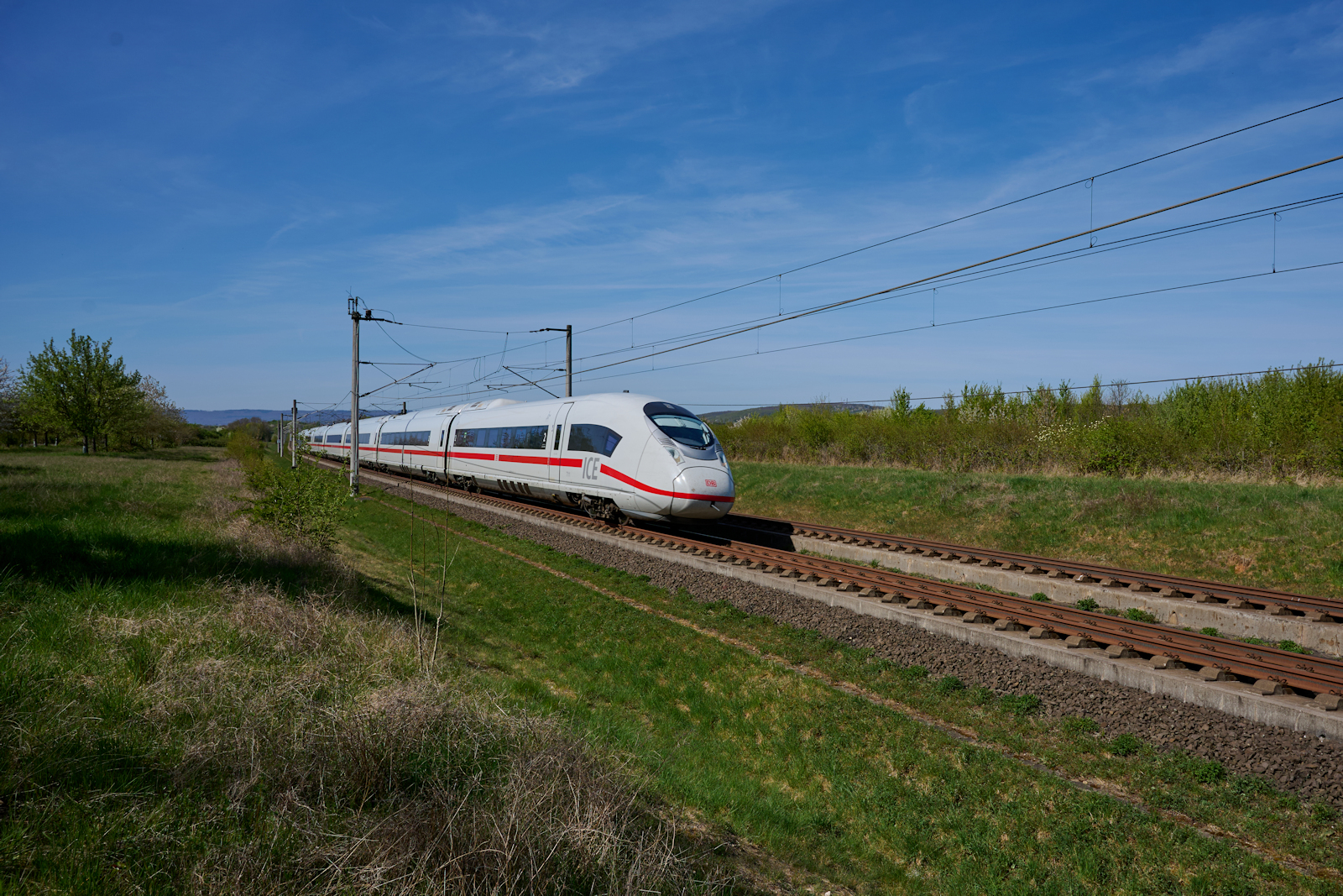 403 029 war am 11.04.2025 als ICE 721 von Essen nach München unterwegs. Bei Bad Weilbach fuhr der Zug über die Schnellfahrstrecke Köln - Rhein/Main.
