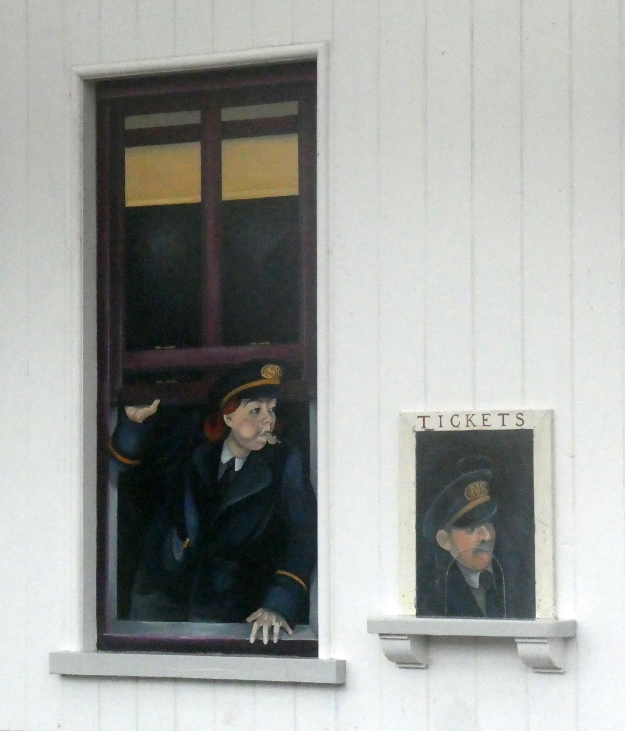 Originelles Gemälde mit Fahrdienstleiterin und Ticketschalter am Bahnhofgebäude in Invergordon. Invergordon, 7.5.2025