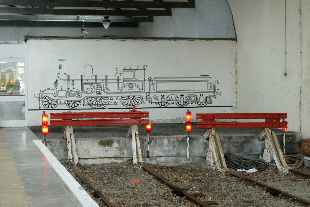 Schönes Dampflok-Gemälde hinter den beiden nördlichsten Prellböcken Grossbritanniens. Thurso, 7.5.2025