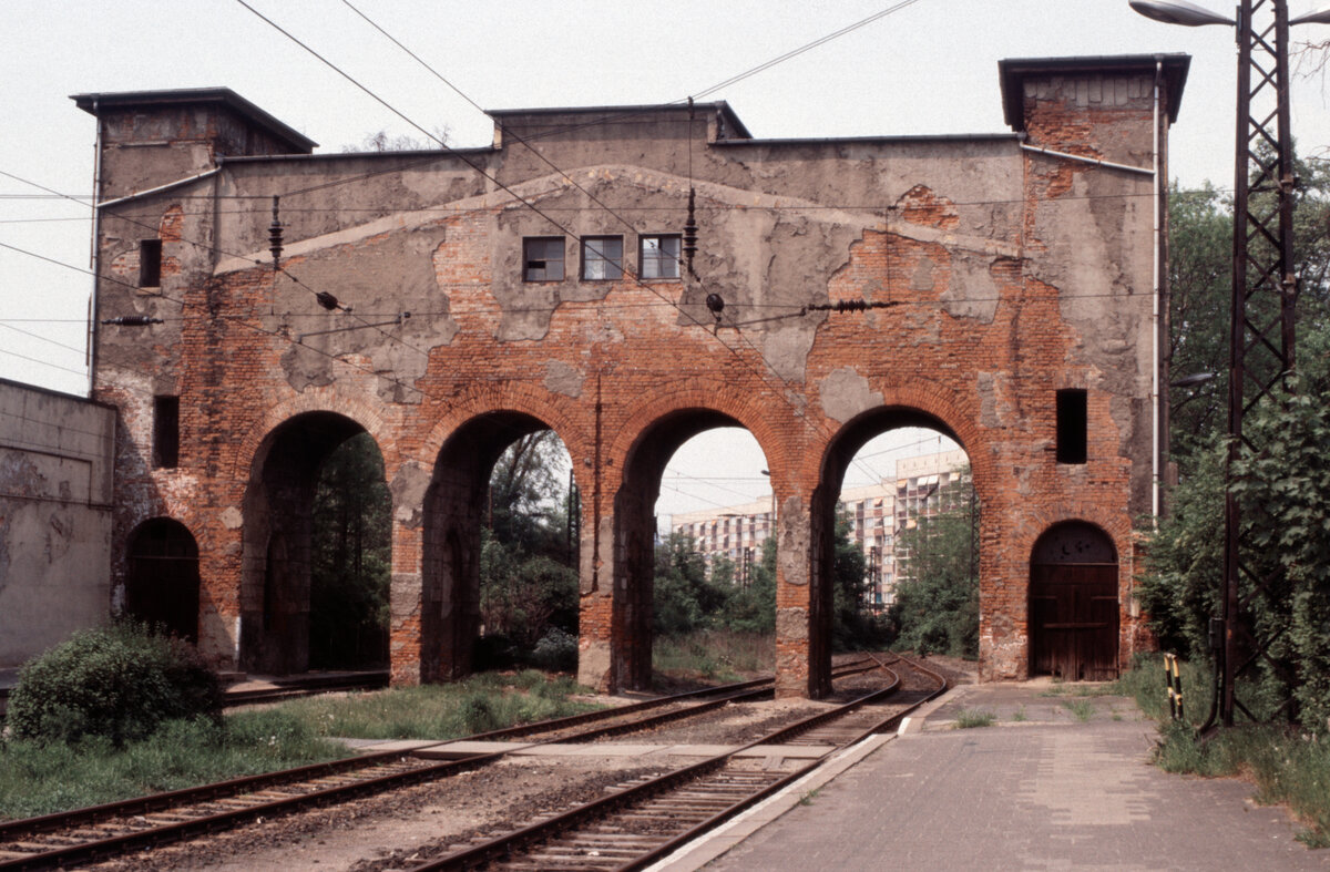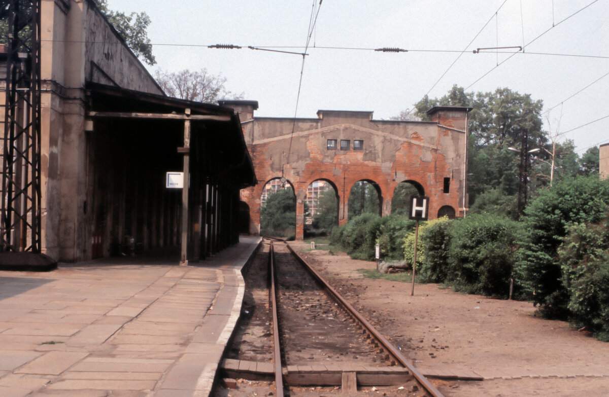 Der Porticus des Bayrischen Bahnhofs in Leipzig, aufgenommen am 20.05.1989. eutlich erkennbar sind die Gleise, die durch drei Portal nach "außen" führten und dort in eine Drehscheibe mündeten. Das vierte Gleis ist nicht mehr vorhanden. (Quelle: Wikipedia).