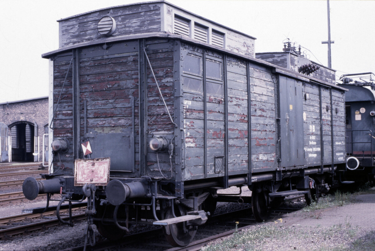 Der Umformerwagen für die im Bw. Worms stationierten ETAs der BR 515, aufgenommen am 07.05.1988 im Bw. Worms.