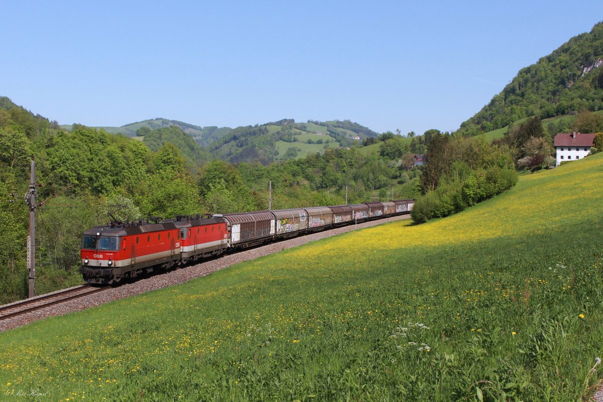 Die 1144 101 und die 1144 255 fahren am 28.4.2025 mit lautem heulen der Lüfter mit einem Ganzzug von Gratwein-Gratkorn kommend entlang der Enns bei Trattenbach in Richtung Wels Vbf.