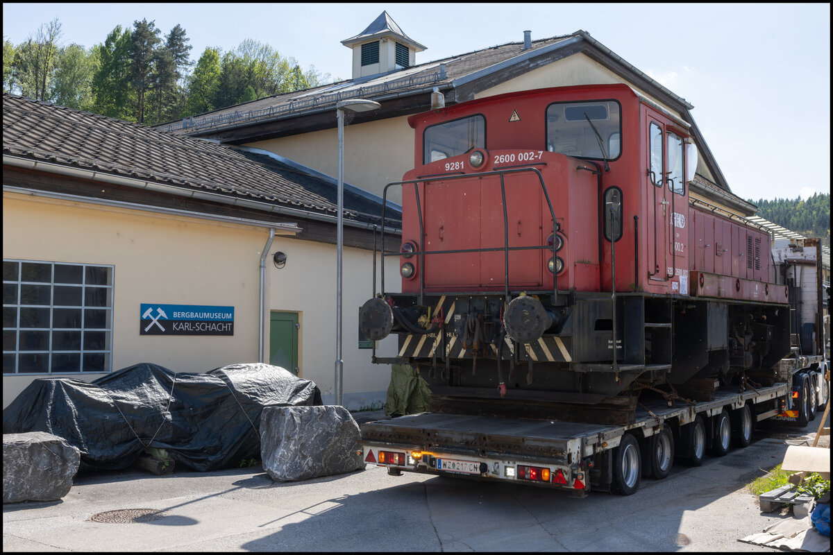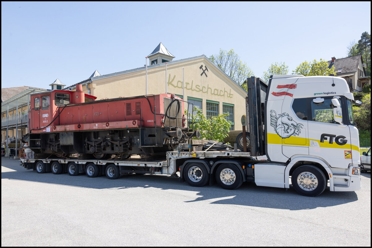 Ziel fast erreicht . An der Einfahrt ins Bergbaumuseum Karl Schacht rollt GKB DH 600.2 auf dem Tieflader ins Museumsgelände. 29.4.2025