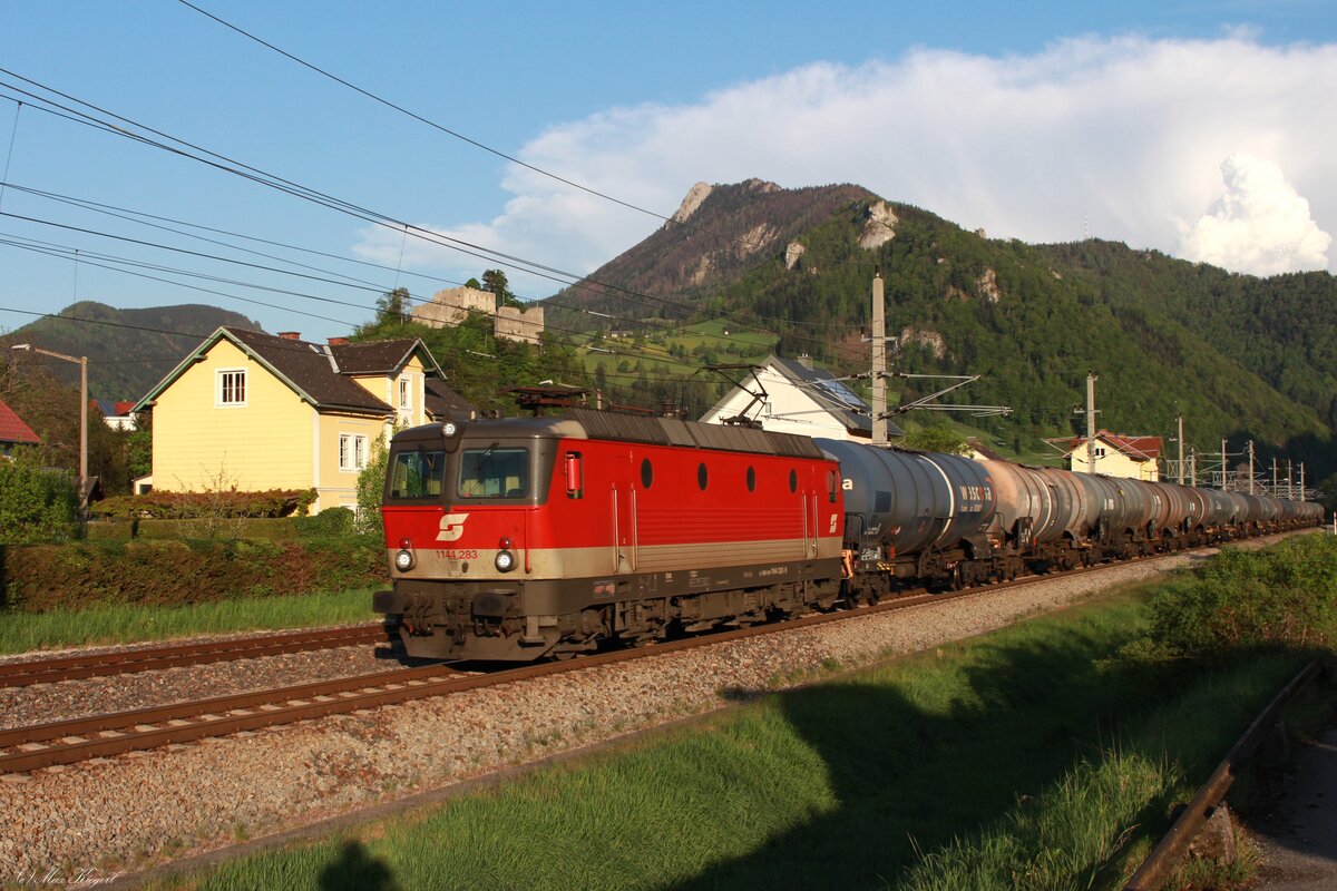 Im letzten Abendlicht des 28.4.2025 fährt die 1144 283 mit einem leeren Kesselwagenganzzug von Klagenfurt kommen durch den Bahnhof Losenstein in Richtung Salzburg Gnigl.