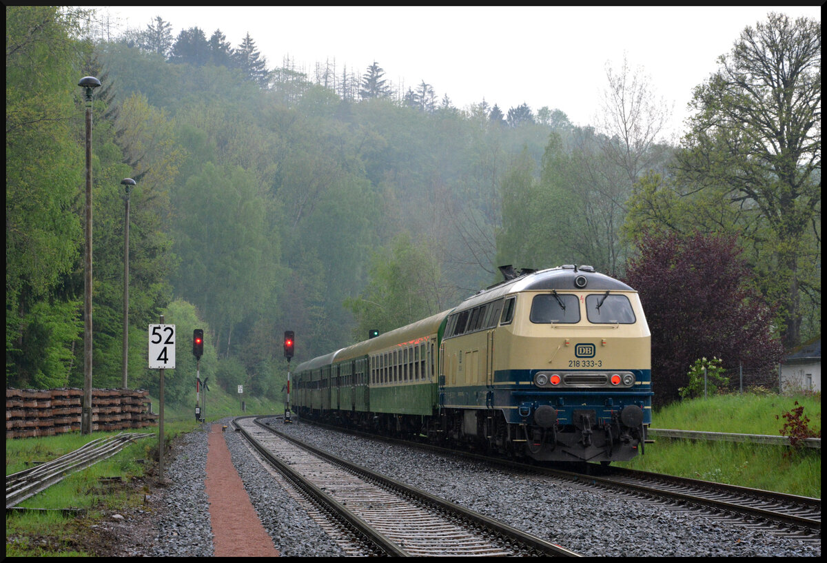 PRESS 218 333-3 schiebt den "Käferzug 2025" am 03.05.2025 bei Reichenbach/Vogtland nach. Der Sonderzug (DZ 1820/1821) bestand aus 11 Reisezugwagen und wurde von PRESS 01 0509-8 befördert.