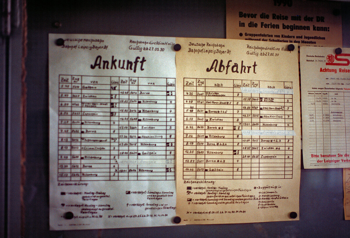 "Wann fährt der nächste Zug?" Auch nach dem Mauerfall gab es am "Bayrischen Bahnhof" in Leipzig einen regulären Fahrplan der DR, leider etwas schwierig durch eine spiegelnde Glasscheibe in der Wartehalle dieses historischen Bahnhofs am 14.10.1990 aufgenommen.