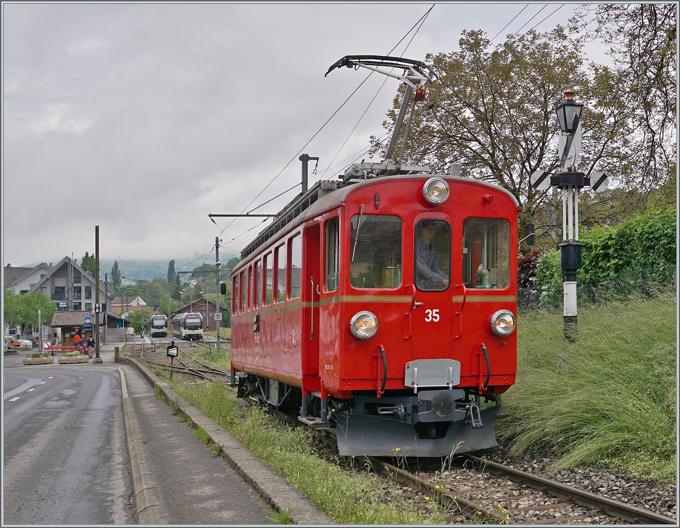 Samstag, 3. Mai 2025; 10:10 - pünktlich mit dem Zeigersprung verlässt der RhB Bernina Bahn ABe 4/4 I N° 35 der Blonay-Chamby Bahn Blonay - Die Saison 2025 ist somit eröffnet!