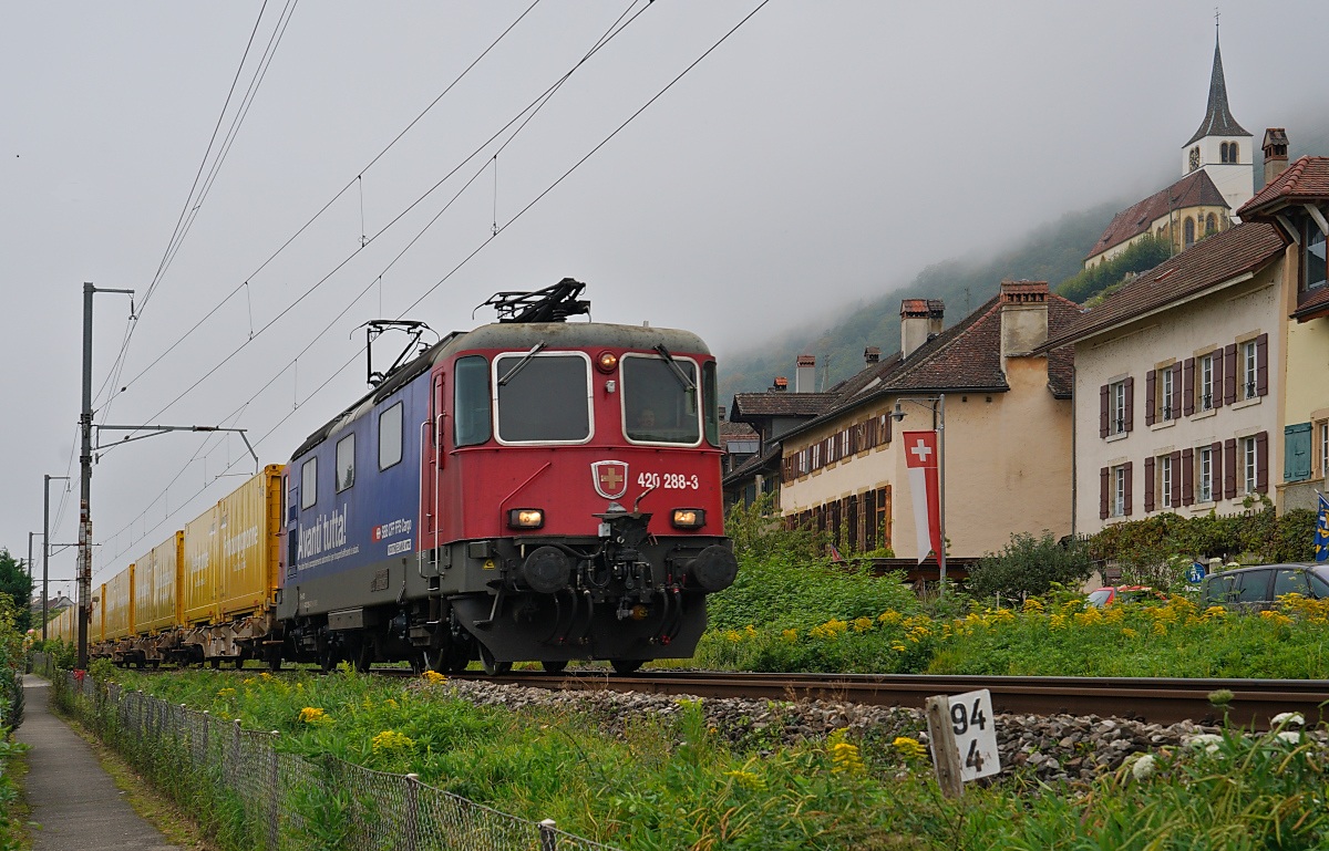 An diesem Morgen stand ich auf einer Brücke in Aigle und wie man sieht ist allerlei zu sehen. Hervorheben möchte ich einerseits den "Association ASD 1914" BCFe 4/4 N° 1 im rechten Bildteil, sowie den IR 90 nach Brig im linken Bildteil.