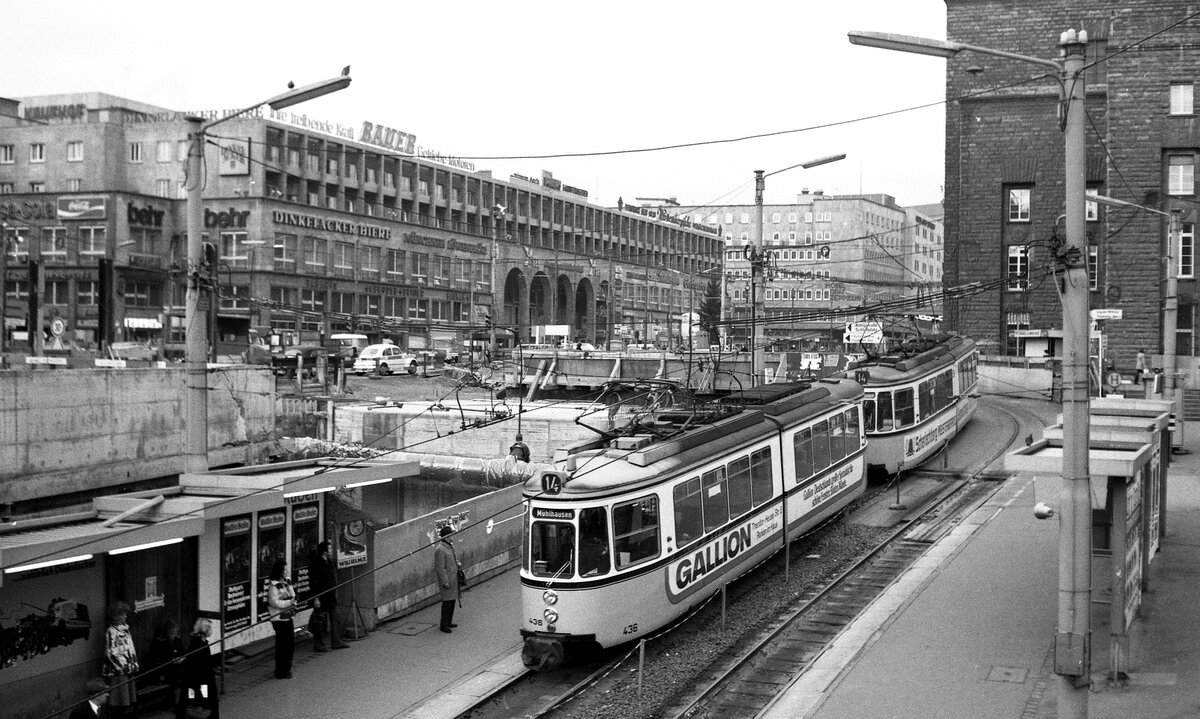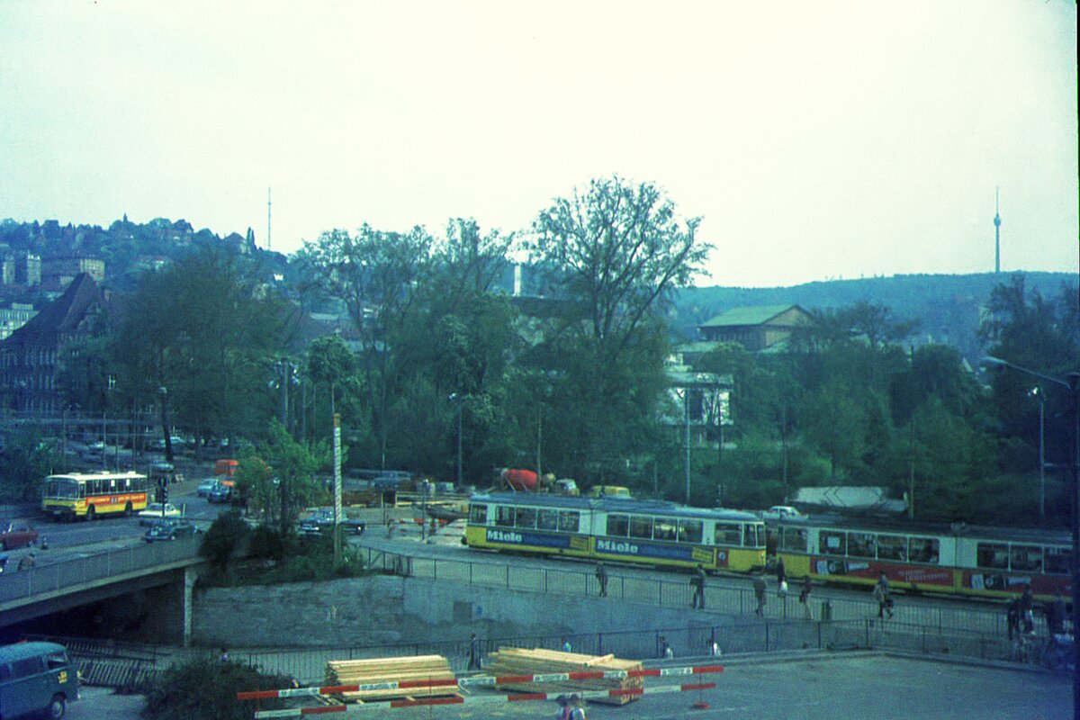 SSB Stuttgart__Gleis- und Tunnelbau__Ca. 20 Jahre lang waren immer irgendwo im Liniennetz die Tunnelrampen zu sehen, wie hier beim Hbf. zur 'Staatsgalerie' mit GT4 436+545 auf Linie 14 nach Mühlhausen. Links davon der noch offene Tunnelstumpf zur U-Station Hauptbhf./Arnulf-Klett-Platz, dahinter die Großbaustelle Bahnhofsplatz.__08-01-1976