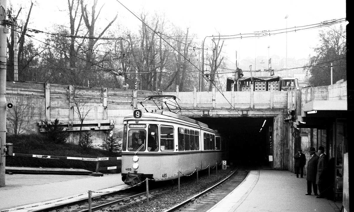 SSB Stuttgart__Gleis- und Tunnelbau__Ca. 20 Jahre lang waren immer irgendwo im Liniennetz die Tunnelrampen zu sehen, als Verbindung zwischen oben und unten. Wie hier von der 'Staatsgalerie' kommend beim Hbf. mit GT4 465 auf Linie 9 nach Botnang.__08-01-1976