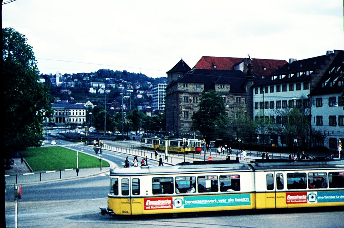 SSB Stuttgart__Gleis- und Tunnelbau__Blick vom Bahnhofsturm. Die untere Königstr. war für viele Jahre Großbaustelle. DoT4 920 auf der Linie 10 biegt aus der Königstr. auf den Bahnhofsplatz. Daß in der Innenstadt aus praktischen und Kostengründen in offener [„Berliner bzw. Hamburger Verbau“] bzw. Deckel-[Mailänder] Bauweise gebaut wurde, bedeutete allerdings auch viele Jahre offene bzw. abgedeckte Baugruben in wichtigen Verkehrsstraßen. Was im Oktober 1974 sogar Sowjet-Kritik hervorrief, vom stellvertretenden Vorsitzenden des Ministerrats der UdSSR Nikolaj Aleksandrovich Tikhonov, bei seinem Stuttgart-Besuch, allerdings in humorvoller Weise vorgebracht. Das damit verbundene Angebot, die Tunnel durch (unbestritten sehr kompetente) russische Tunnelbauer rein unterirdisch fertig bauen zu lassen wurde seitens des verantwortlichen Tiefbauamts nicht angenommen. [‚Stuttgarter Nachrichten‘ 15.10.1974]. __08-01-1976