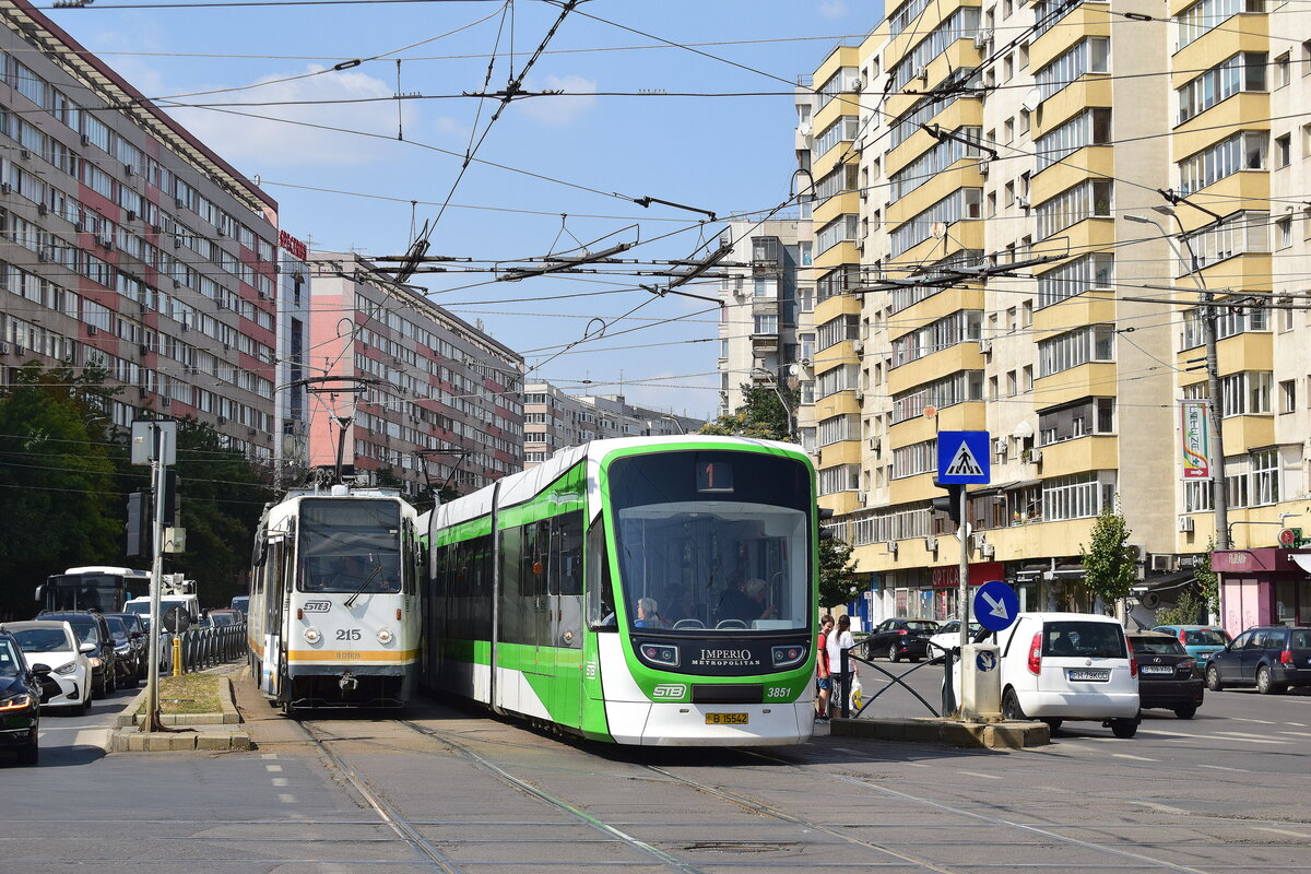 Treffen der Generationen. 50 Jahre liegen zwischen diesen beiden Fahrzeugtypen. Links einer der ältesten Fahrzeugtypen in Bukarest Triebwagen 215 vom Typ V3A Baujahr 1972-1990 auf der Linie 10 und rechts der neuste Fahrzeugtyp in Bukarest, ein Astra Imperio Metropolitan Baujahr 2022-2024 auf der Linie 1. Hier fahren sie die Soseaua Mihai Bravu entlang und passieren hier den Bulevardul Ferdinand I.