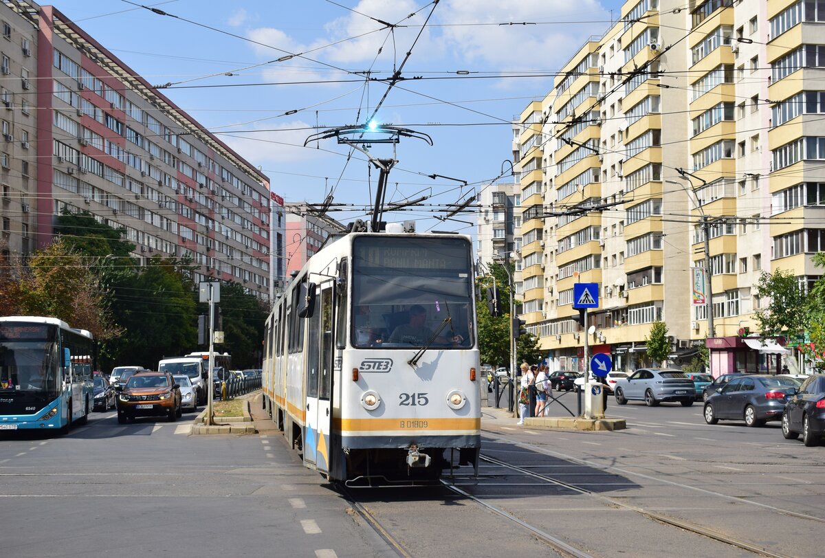 Triebwagen 215 überquert den Bulevardul Fernidand I und fährt weiter auf der Linie 10 die Soseaua Mihai Bravu entlang.