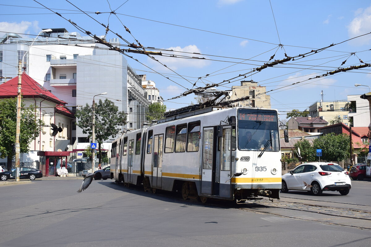Triebwagen 335 biegt vom Bulevardul Ferdinand I in die Srada Traian und verjagt dabei einige Tauben.