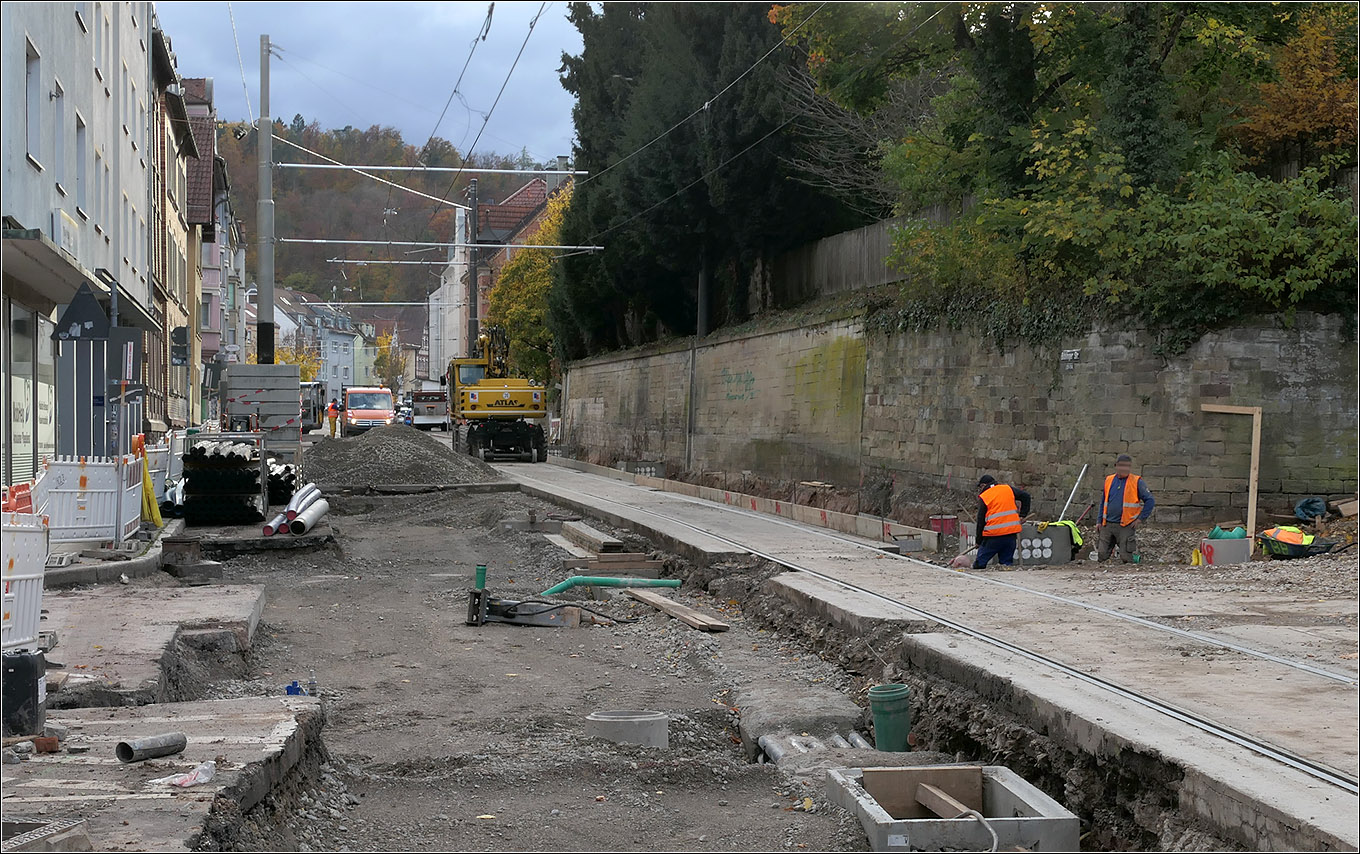 Stadtbahnausbau in Stuttgart-Heslach - Haltestelle Erwin-Schöttle-Platz: Blick in Richtung Innenstadt auf das Baustellchaos an dieser Haltestelle. Beide Gleise werden in eine neu Position gebracht, werden aber wie bisher auf einem eigenen Bahnkörper liegen. Der Mittelbahnsteig wird hier eine Länge von 74,54 Meter haben. 28.10.2025 (M)