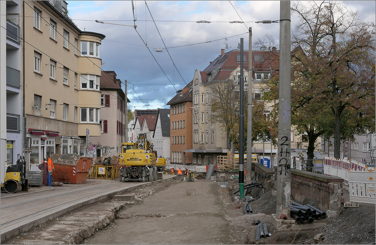 Stadtbahnausbau in Stuttgart-Heslach - Haltestelle Bihlplatz Fahrtrichtung Innenstadt: Hier müssen beide Gleise auf die gesamte Länge in eine neue Lage verlegt werden um einen möglichst geringen Bogen im Bereich des Bahnsteiges zu erhalten, was die Spaltbreite zwischen Bahn und Bahnsteigkante klein hält. Der bisherige Bahnsteig wurde bis auf die Zugangsrampen komplett abgerissen. Die neue Länge wird 70,95 Meter betragen. Bis auf eine kurzes Stück in der Hohenheimer Straße stadtauswärts unterhalb der Haltestelle Dobelstraße fahren bislang alle mit langen Zügen betrieben Linien auf eigenem Bahnkörper. Hier wird es das erste Mal Regelbetrieb mit Doppeltraktionen im durch eine enge Straße im Straßenraum geben. Gelegentlich gab es bislang aber immer wieder umgeleitete U7-Langzüge auf der Steilsstrecke der U15 hinauf zur Ruhbank, die hier ohne Halte durch die steile und enge Straßen fuhren. Schon bei der ersten Durchfahrt eines Stadtbahnwagen durch Heslach vor Aufnahme des Stadtbahnbetriebes 1986 staunten die Stuttgarter nicht schlecht, wie groß diese im Vergleich zur gewohnten GT-4 Straßenbahn war. Die Doppeltraktionen der U1 durch Heslach werden da schon beeindrucken, handelt es sich von den Dimensionen eigentlich um einen in der Straße fahrenden U-Bahnzug. 28.10.2025 (M)