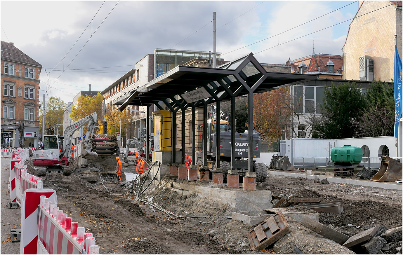 Haltestelle Erwin-Schöttle-Platz: Blick in Richtung Innenstadt auf das Baustellchaos an dieser Haltestelle. Beide Gleise werden in eine neu Position gebracht, werden aber wie bisher auf einem eigenen Bahnkörper liegen. Der Mittelbahnsteig wird hier eine Länge von 74,54 Meter haben.