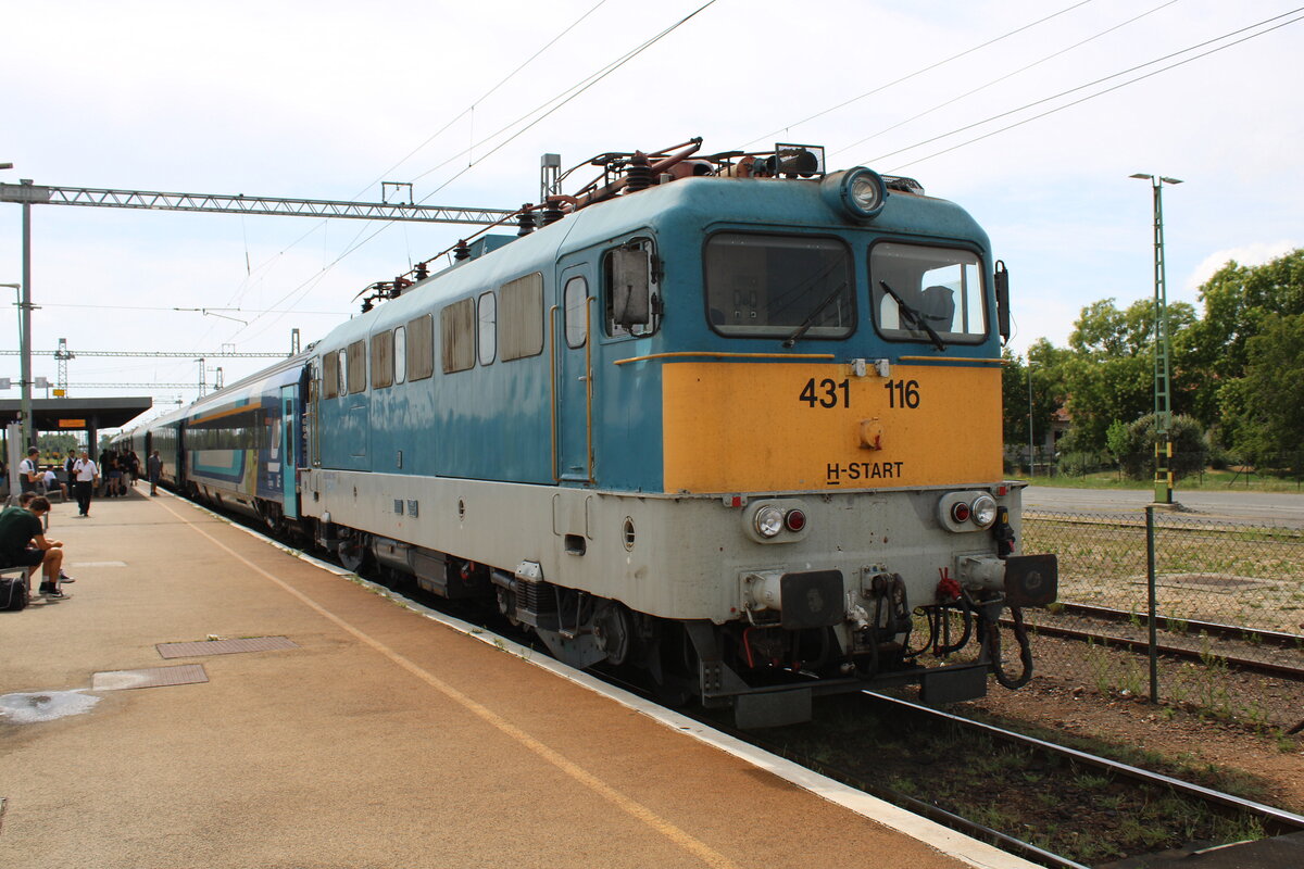 MÁV-START 431 335 mit dem IC 19794 "Kék Hullám" vom Budapest-Déli nach Tapolca, am 26.07.2025 nach der Ankunft in Balatonfüred. Da in Balatonfüred der Fahrdraht endet, übernahm die Diesellok MÁV M41 2143 den Zug bis Tapolca.