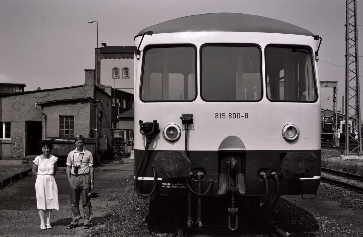 Mama und Papa vor einem Akkuzug der DB (815 800-8) im Bw Limburg (22.08.1985)