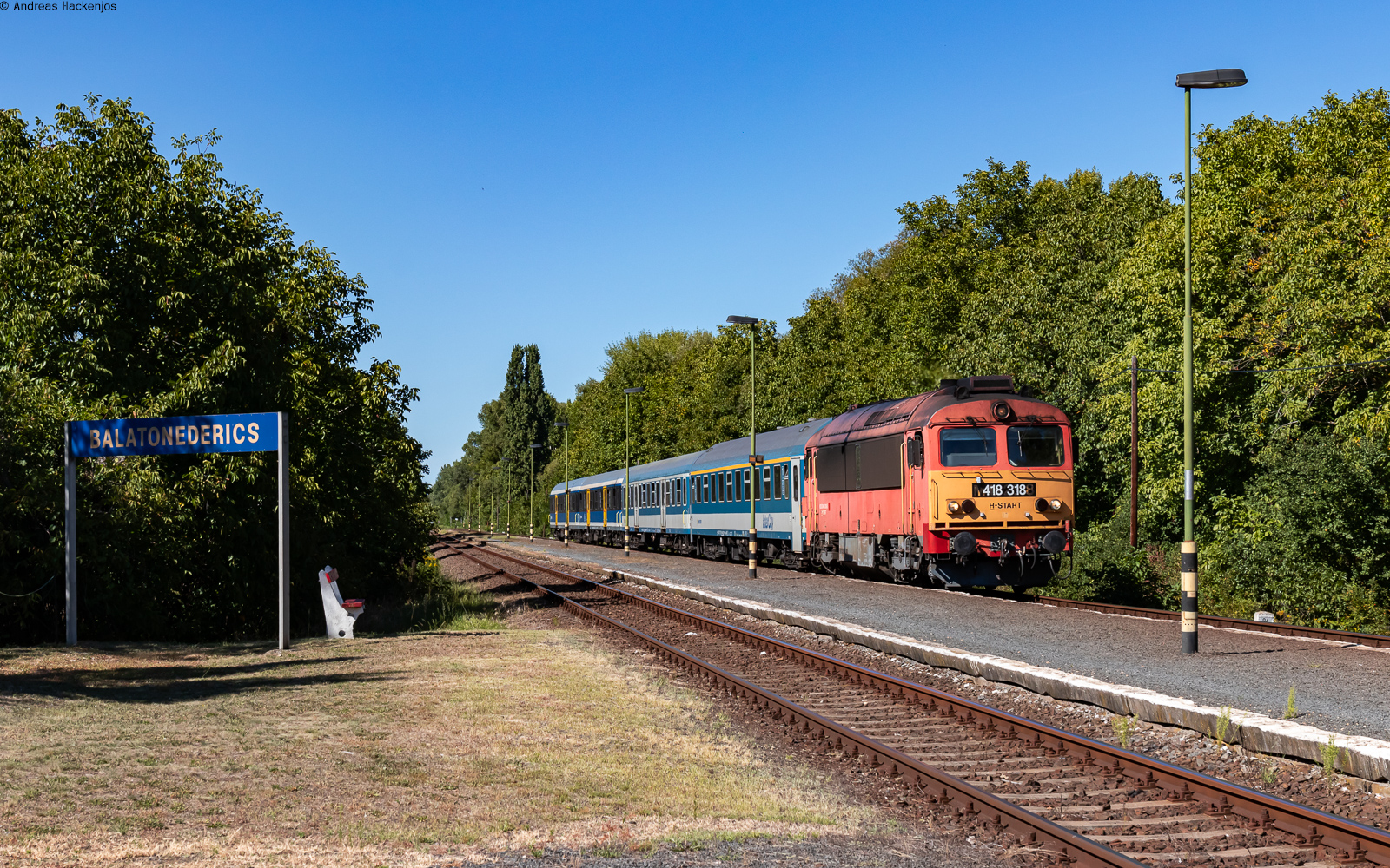 418 318 mit dem Ex 8895 "Fenyves" (Tapolca - Pecs) im Bahnhof Balatonederics 24.8.25