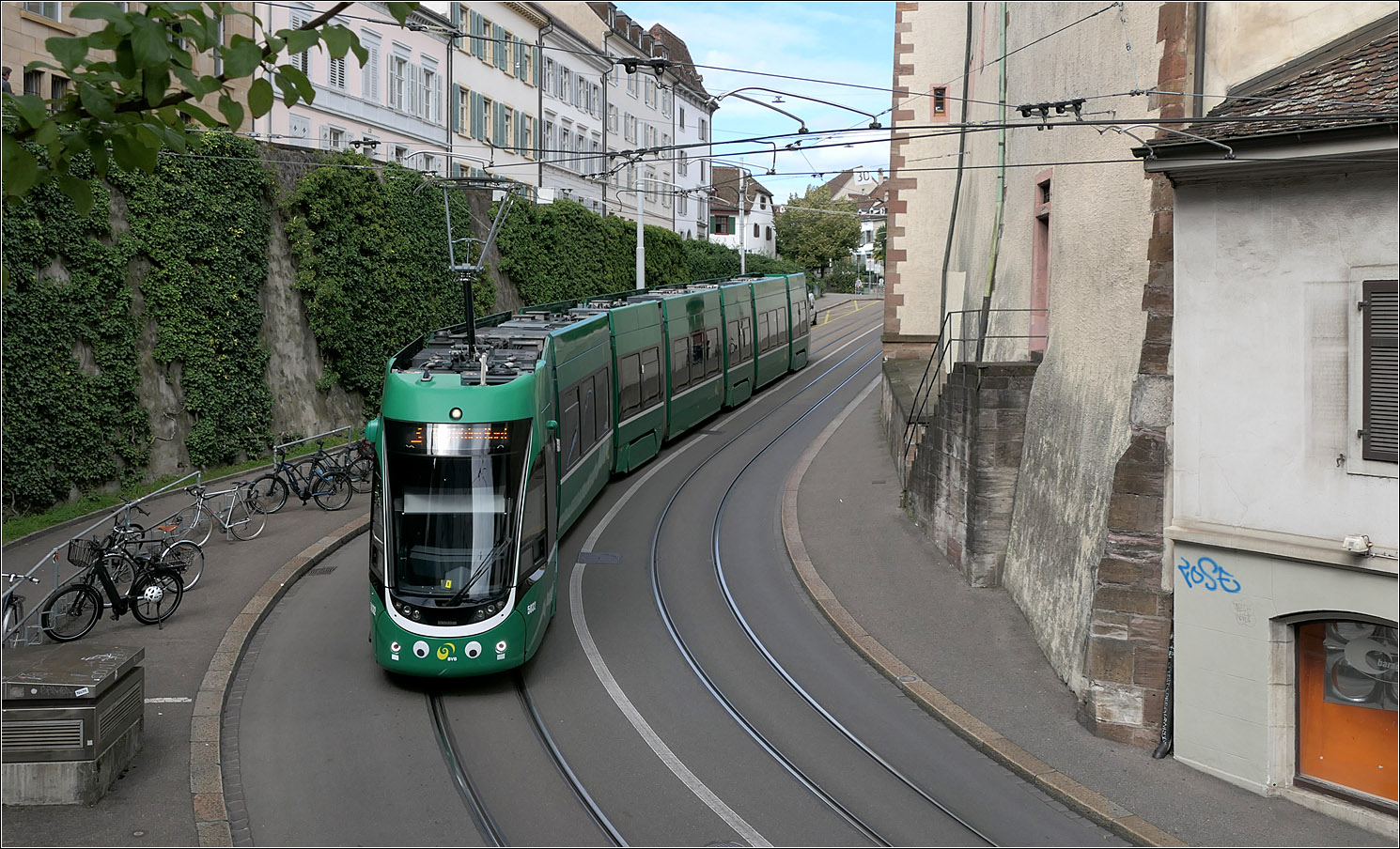 ... fährt Flecity 2 5043 in die Spalenvorstadt ein, auf ihre Weg auf der Linie 3 nach Birsfelden.