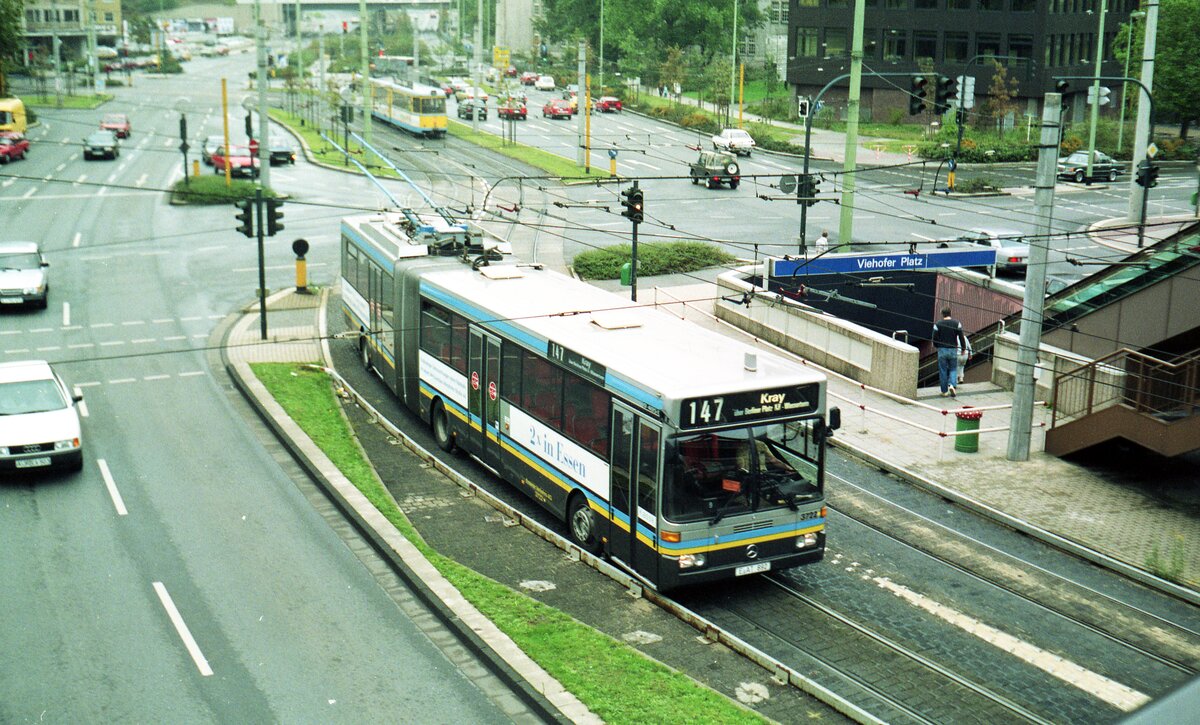 EVAG Essen__Elektrische Straßenbahn auf Gummi-Reifen. Wagen 3722 auf Linie 147 nach Kray.__23-09-1989