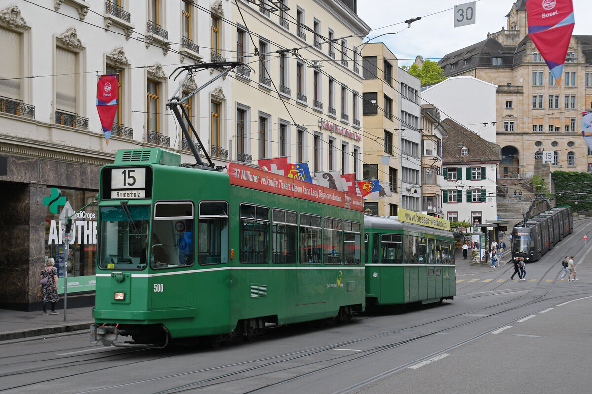 Be 4/4 500 zusammen mit dem B4S 1456, auf der Linie 15, fährt am 21.07.2025 den Steinenberg hoch zur Haltestelle Bankverein. Aufnahme Basel.