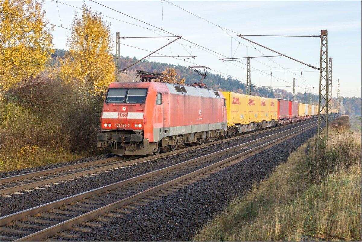 152 165-7 ist mit einem DHL-Zug in Richtung Süden unterwegs,gesehen am 05.11.2025 bei Kerzell.