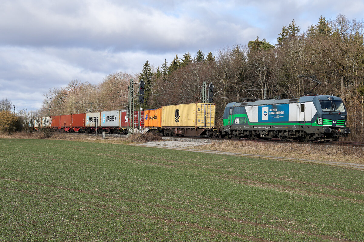 193 251 ELL/WLC mit einem Containerzug bei Eglharting am 13.02.2026.