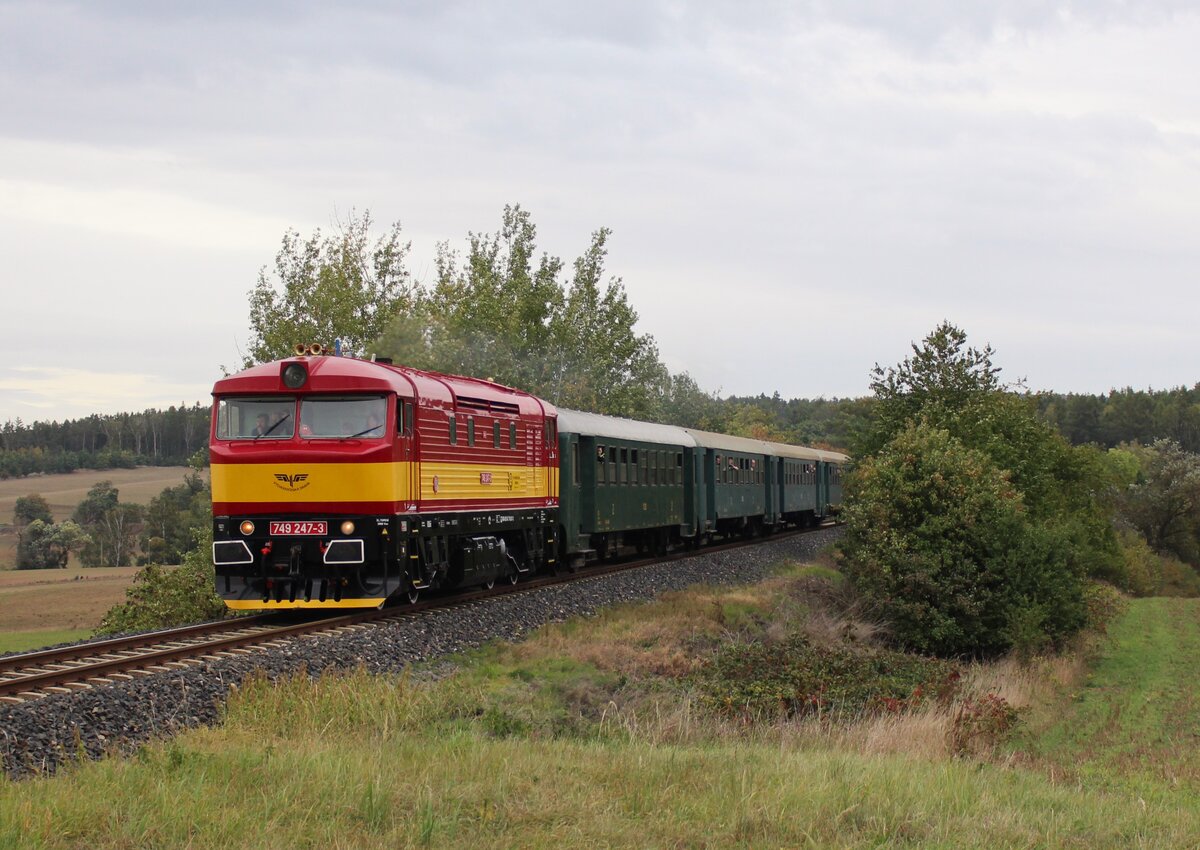 749 247-3 fuhr am 07.10.23 einen Sonderzug im Rahmen des Badotka Treffen in Lužná u Rakovníka einen Sonderzug von Lužná u Rakovníka nach Rakovnik. Hier ist der Zug bei Lužná u Rakovníka zu sehen.