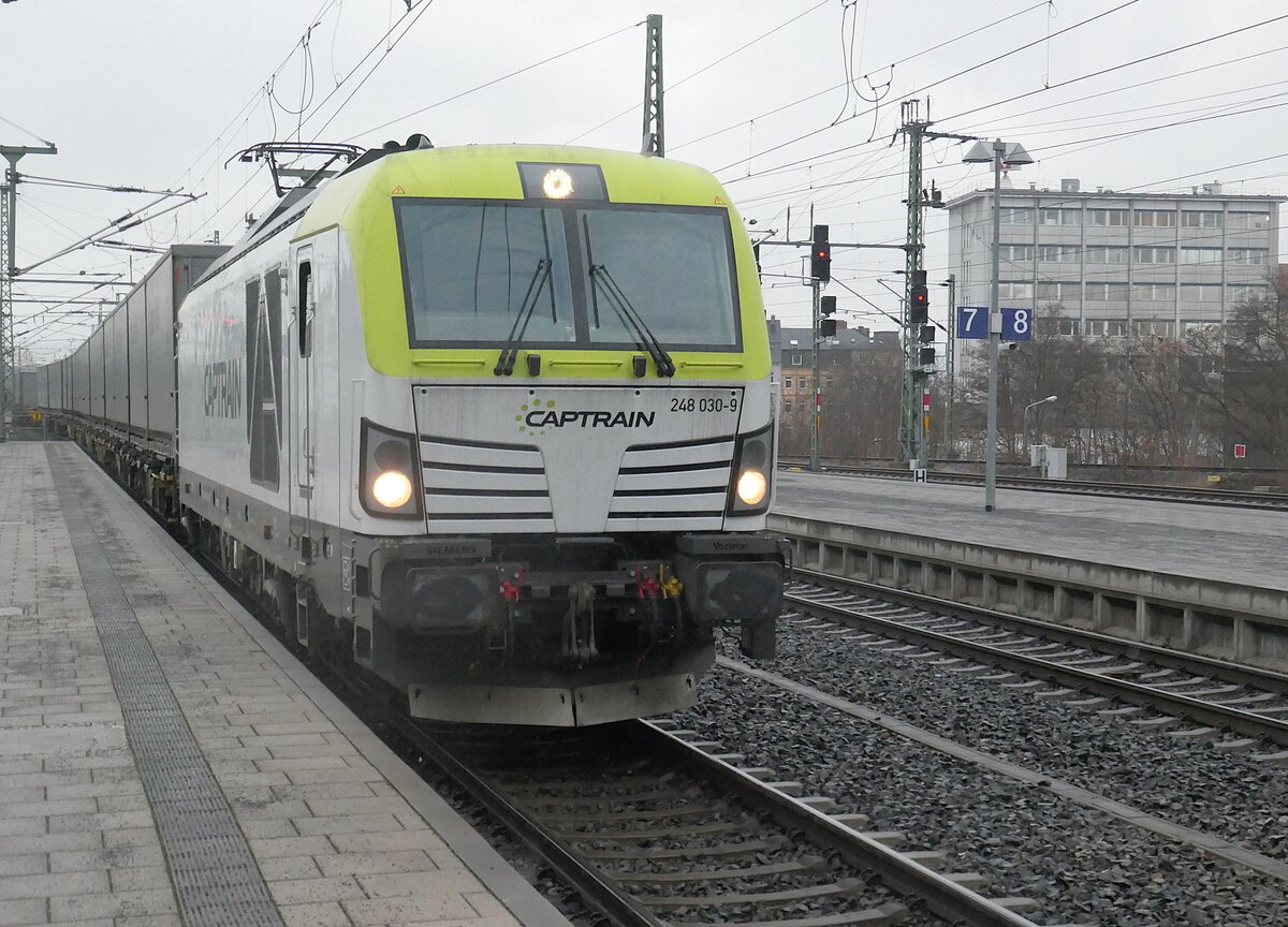 Die nummernmäßig letzte Vectron DualMode von Captrain, 248 030, durchfährt mit einem Frachtzug den Bahnhf Dresden-Neustadt im Februar 2026.
