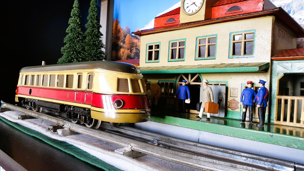 Diorama Spur 0 Antik 1930er/1950er Jahre Bahnhof BUB (KBN) mitMärklin TW 930 u.Preiser Figuren. PW