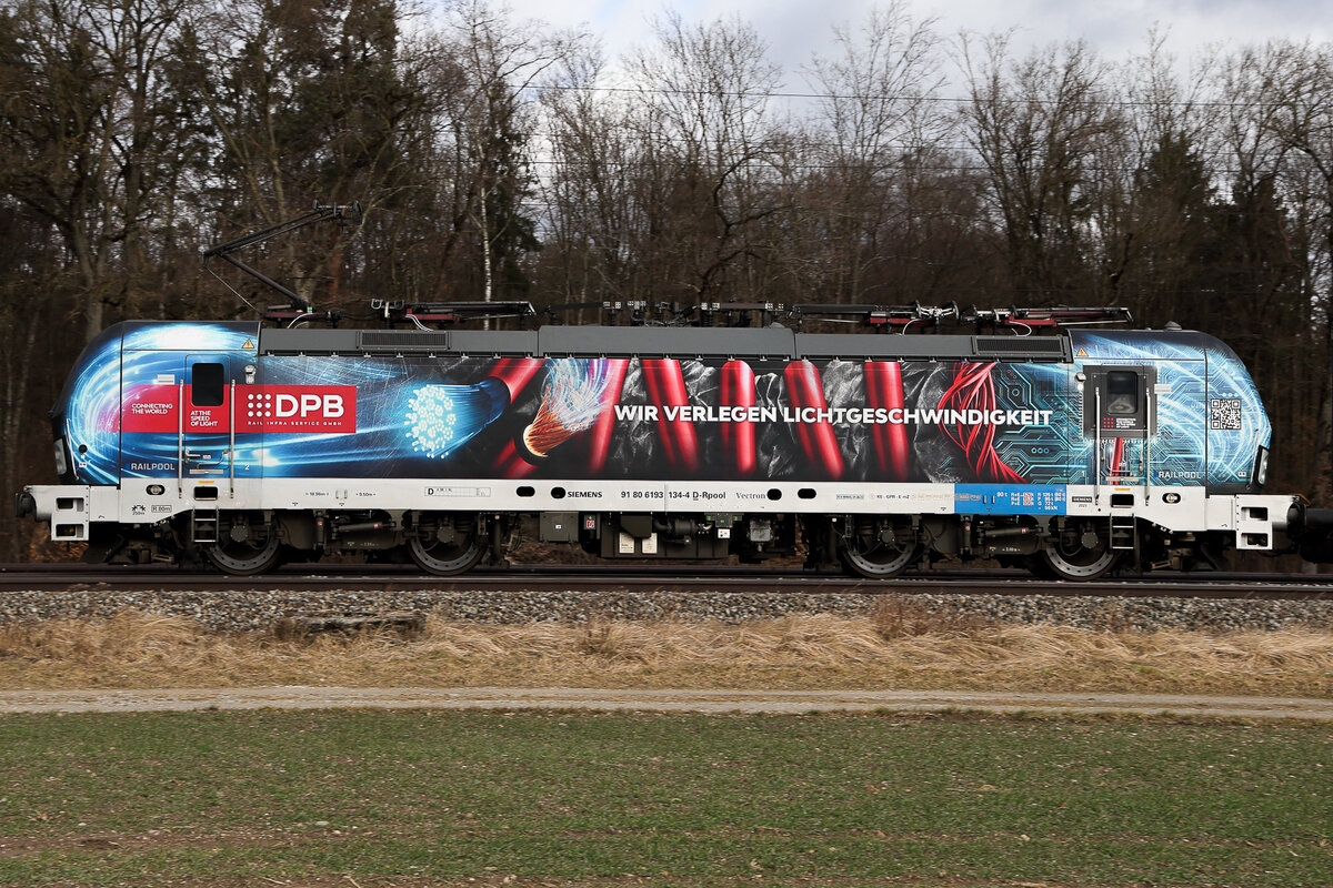 DPB 193 134. Gab es schon in railpool und Rail Force One Bemalung. Nun DPB wir verlegen Lichtgeschwindigkeit. Die Sonne gab nicht all zuviel Helligkeit her an diesem Tag, aber diese Farben leuchten kraftvoll bei dem Kontrast mit dem Wald im Hintergrund. Eglharting 13.02.2026.