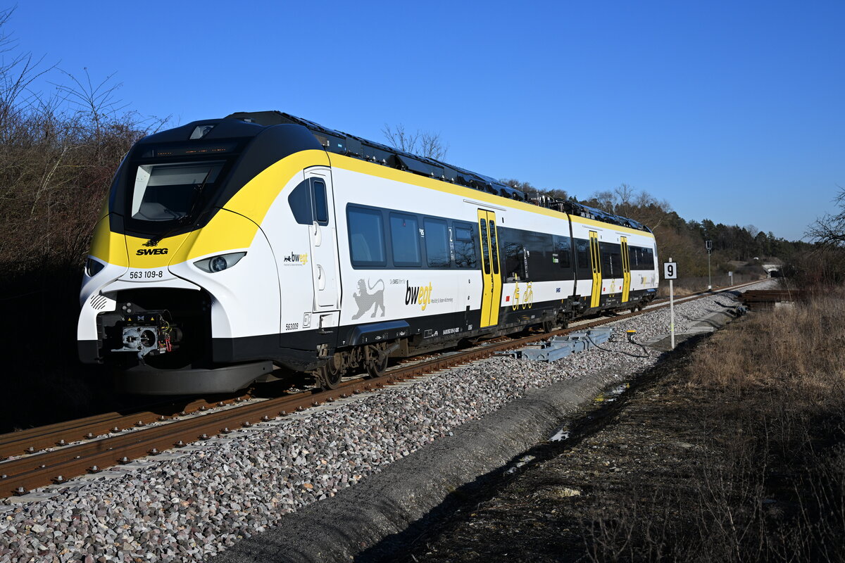 Wenn man mit der Treppe und dem Aufzug ankommt und man sieht den Zug so und er bewegt sich nach links, dann hat man ihn leider verpasst. Mireo Plus B 563 017/117 bei der Abfahrt im Bahnhof Calw.