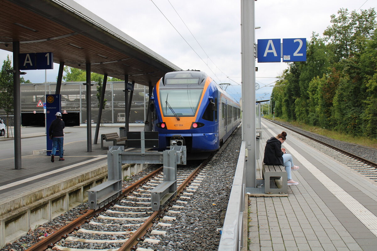An diesem Prellbock am Bahnsteig 1 in Eschwege Stadtbahnhof endet heutzutage die Strecke. Früher gings hier über die "Kanonenbahn" weiter Richtung Leinfelde. Der Cantus 427 004 hat hier als RB 24178 von Bebra nach Göttingen einen planmäßigen Aufenthalt von 29 Minuten.